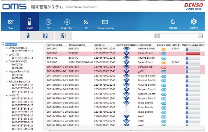 The BHT DMS(Device Management System) is composed of a client application designed to run on terminal and a management application on a PC. The DMS is used to manage the terminal, update the application software and OS, transmit master files and others, and collect result files. Central management based on a network will reduce the burden imposed on the system administrator.