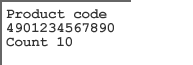 private dspdata$ private quantity% print "Product code" dspdata$ = "4901234567890" print dspdata$ print "Count"; quantity% = 10 print quantity%