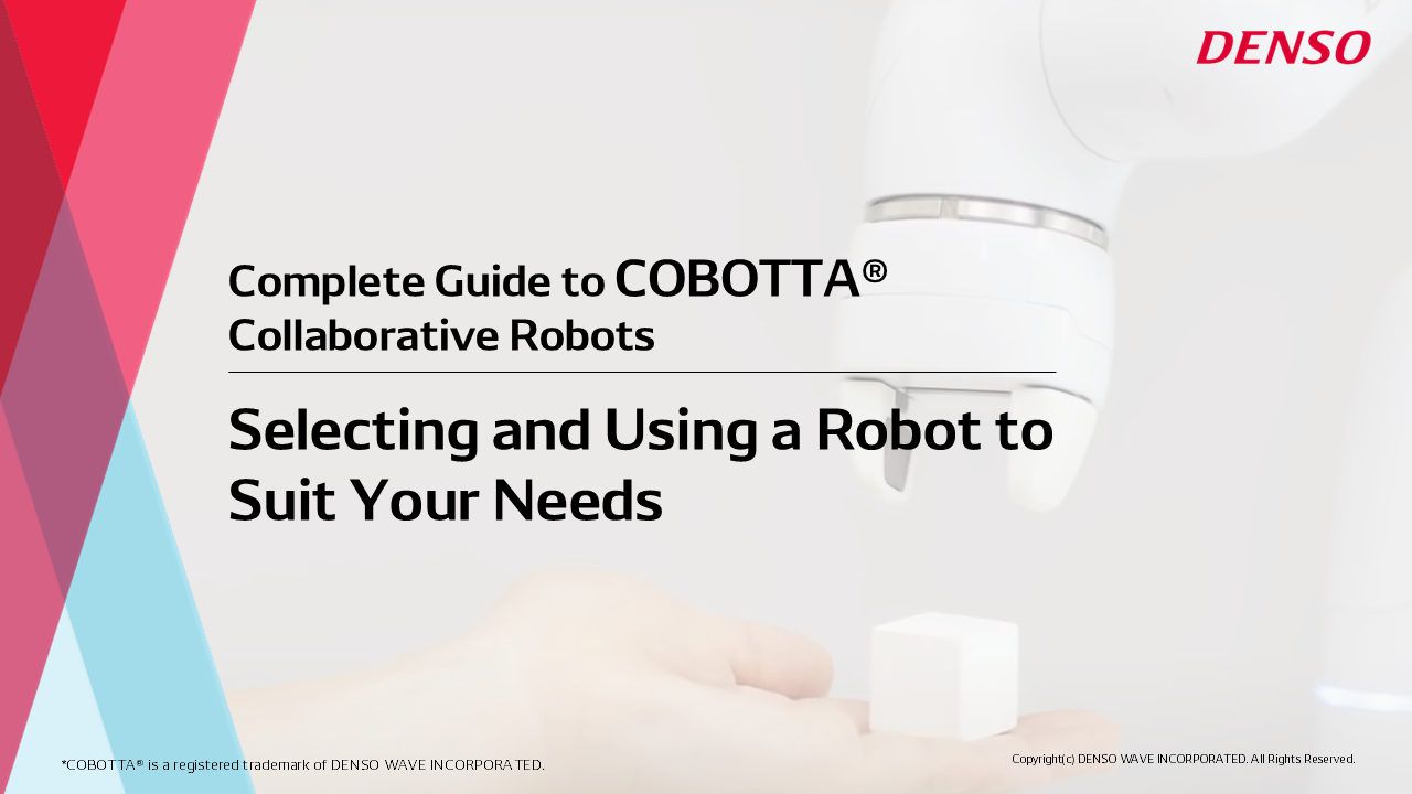 COBOTTA collaborative robotThis document explains everything from the fundamentals of COBOTTA—an easy‑to‑use and safe collaborative robot—to the benefits of implementation and the various control methods that can be selected to suit different users.