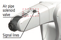 A 17-wire signal cable and an Ethernet port are added to the tip of the flange (the sixth axis), which is an optional specification. This enables users to install an electric hand and camera at the tip of the flange without worrying about tangles or breakages in cables.