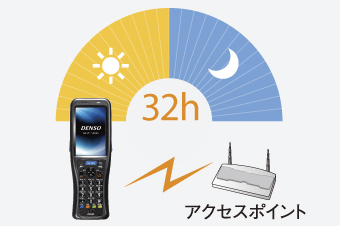 独自の省電力設計で、無線を常時接続した状態でも30時間以上の動作を実現しました。24 時間稼働の工場など、あらゆる現場での作業で、こまめに充電することなく、連続してお使いいただけます。