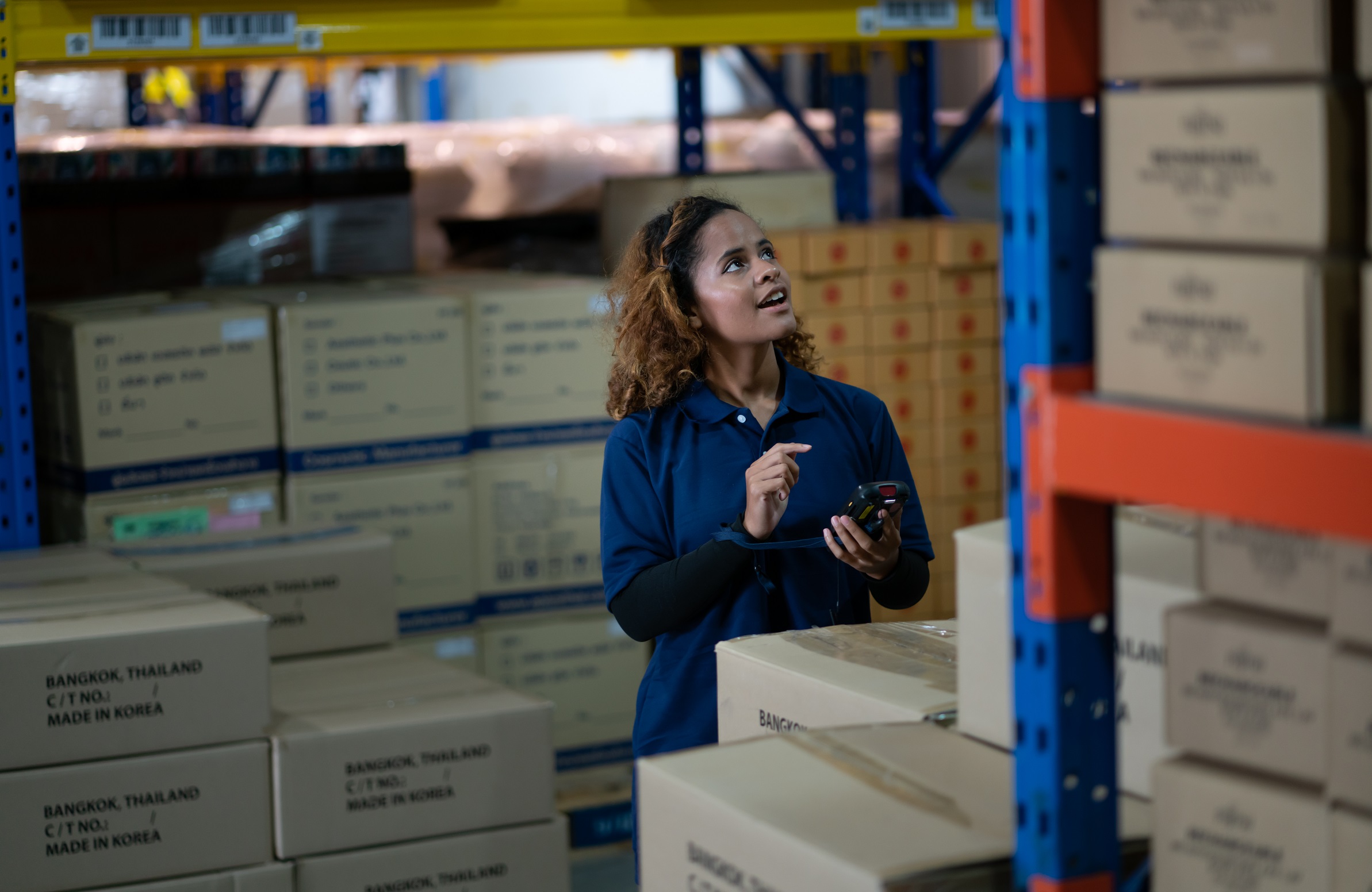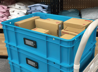 RFIDスキャナを使用して、サプライチェーンの中で動いている梱包箱のIDを読み取り。