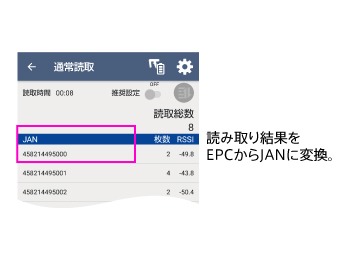 EPCをJANに変換。 ※SGTINのコード体系でタグにエンコードされている必要があります。 |