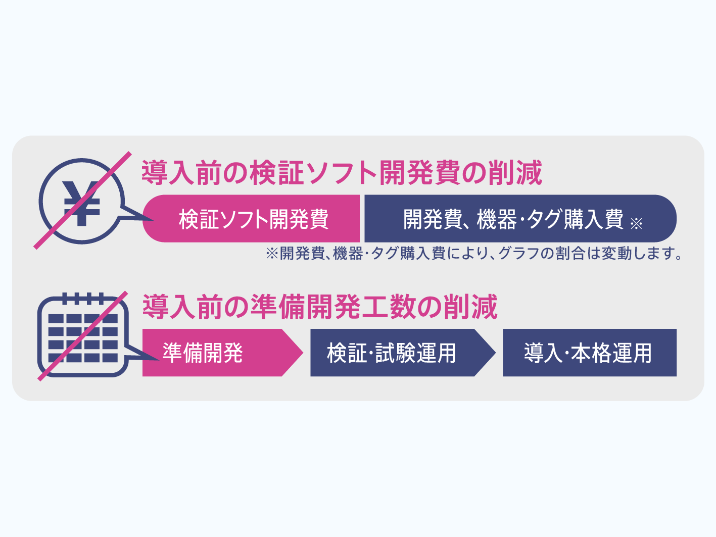 検証ソフトの開発が不要なため、導入までのトータルコスト・期間を圧縮します。検証ソフトの開発費、導入前の準備開発工数を削減します。
