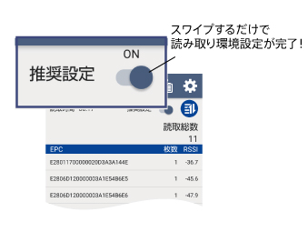 読み取り時の環境設定が、推奨設定ボタンをONにするだけで完了。RFIDの専門知識がなくても、操作に迷いません。