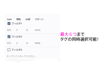 プレフィルタ | 読取った結果(EPC/TID/USER)を、スマホに取り込むか否かをフィルタリング(同時に最大6つ) | |||