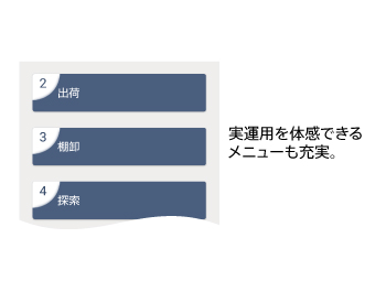 入荷・出荷・棚卸・探索など本運用を体感できる業務メニューも充実。実運用さながらの検証が可能です。