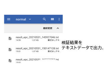 読取結果をAndroid端末からPCへ出力(USBケーブル経由)。検証結果をPCで分析・記録したり、既存システムとの手動連携が可能です。
