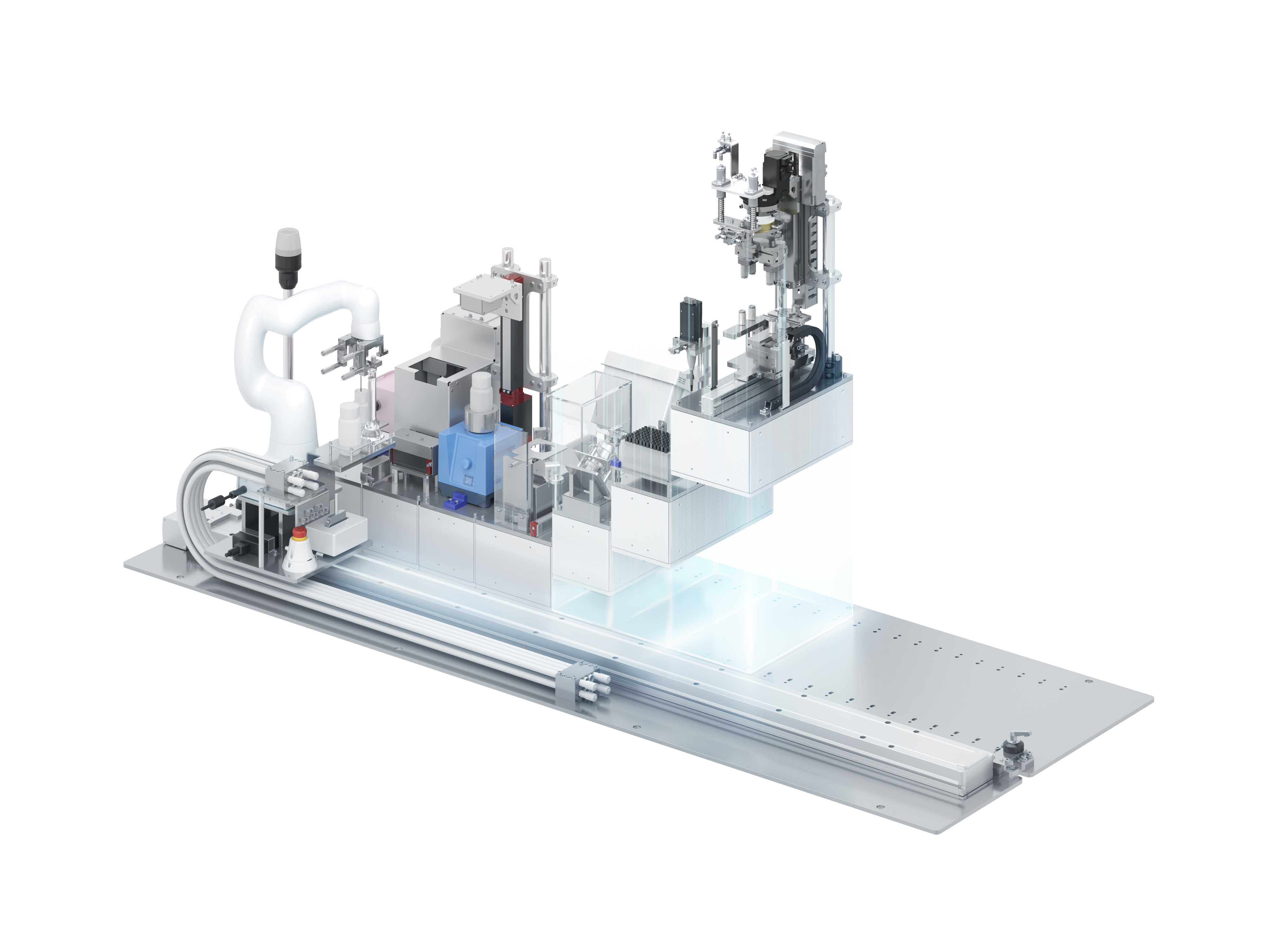 モジュールの組み合わせや配置は自在。COBOTTAが走行軸で移動し、各モジュール間をスムーズに連携。広範囲をカバーし、多様なニーズに対応します。