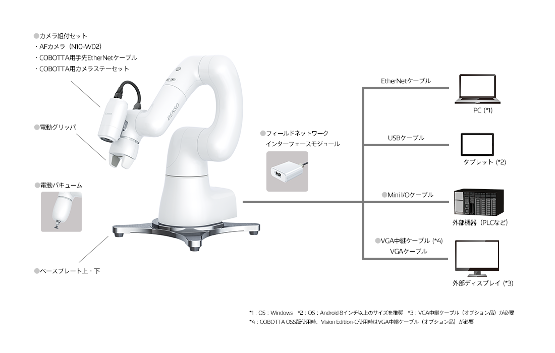 ソフトウェア | 標準版:COBOTTA専用ソフトウェア OSS版:なし(お客様にてLinuxなどをインストール可能) |