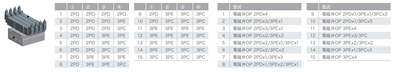 | オプション有り | - | 1系統(φ8 ×1) 電磁弁専用8系統(φ6×8) [電磁弁はa,b,cの組合選択式] a. 2ポジションダブルソレノイド b. 3ポジションエキゾーストセンター c. 3ポジションクローズドセンター |