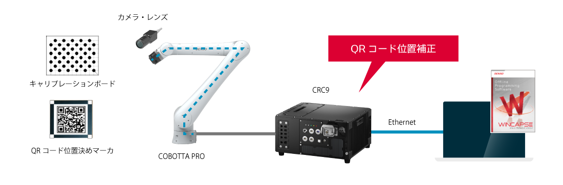 作業台に貼り付けされたQRコード位置決めマーカをカメラで認識し、再ティーチングすることなく座標を補正します。