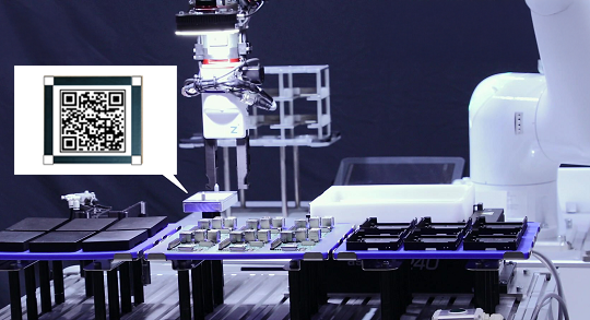 AMRに載ったロボットがQRコードを読み取り、位置を補正し、作業場に応じたタスクを実行可能。