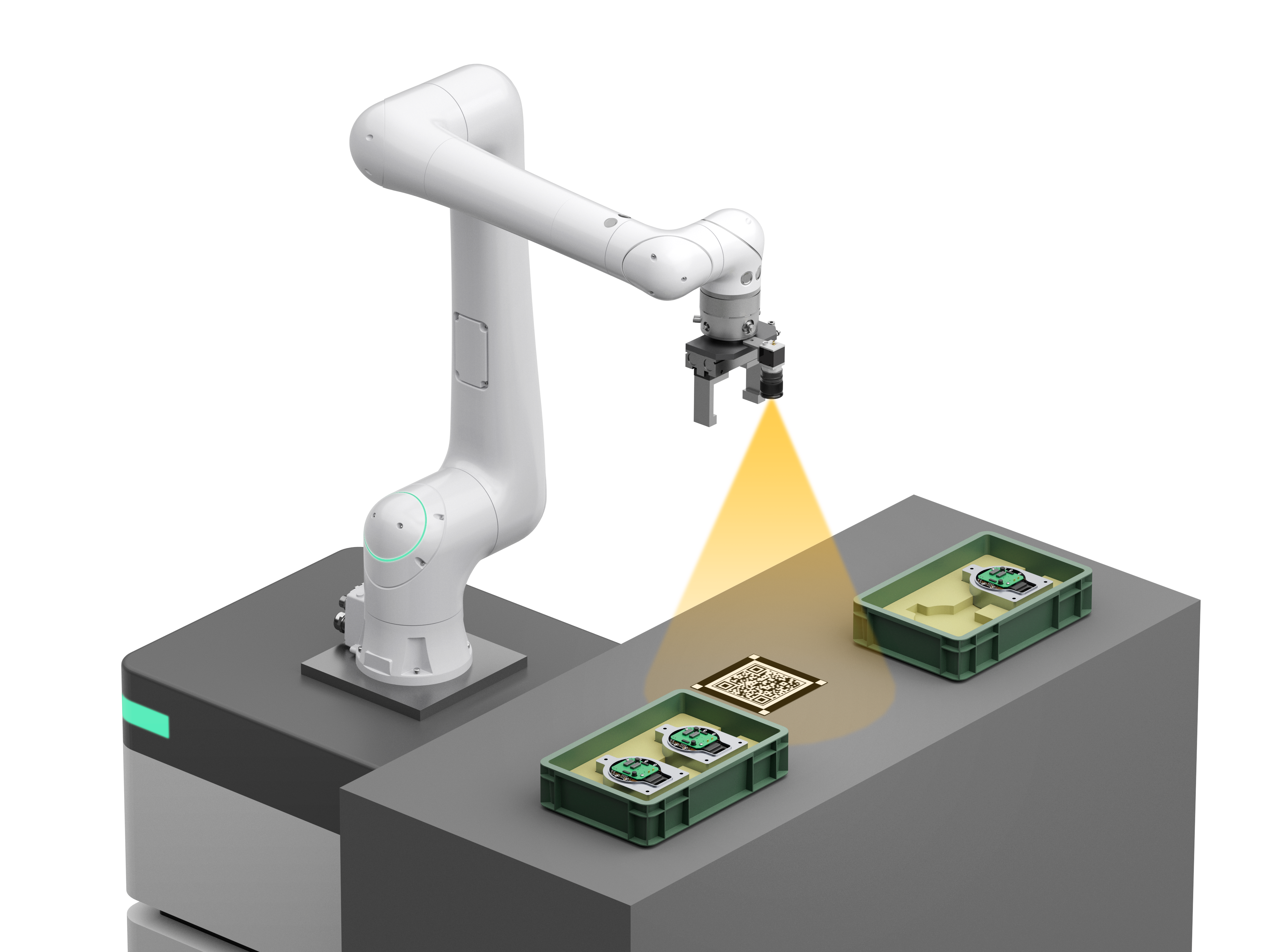 作業台に貼付されたQRコード位置決めマーカをカメラで認識することで、ロボットを搭載したAMRや台車などと作業台の相対位置が変化した場合でも再ティーチングすることなく座標を補正できる機能です。