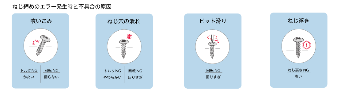 ねじ締めの不具合は、締め付けトルクやねじ回転量、ねじ浮きの異常によって発生します。