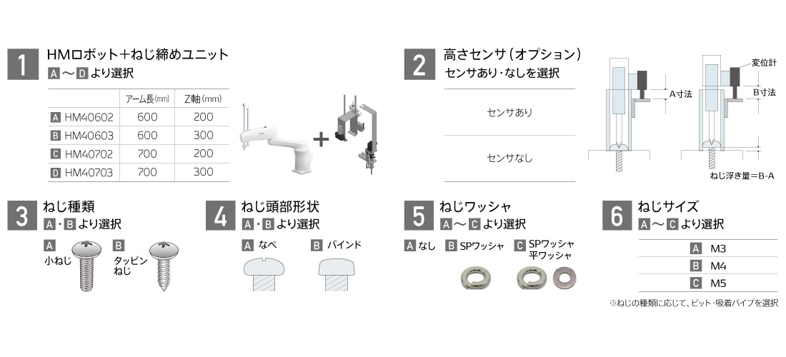 | ねじ締めユニット | 適用ねじ | 種類 | 小ねじ(並目メートル)、タッピンねじ | ||