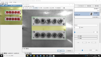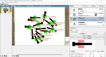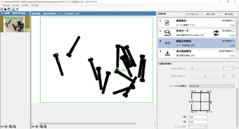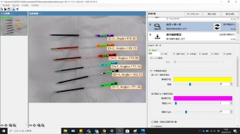 画像の色情報と対象物の面積・周囲長などの特徴量から対象物を絞り込み、位置角度を検出できる機能。