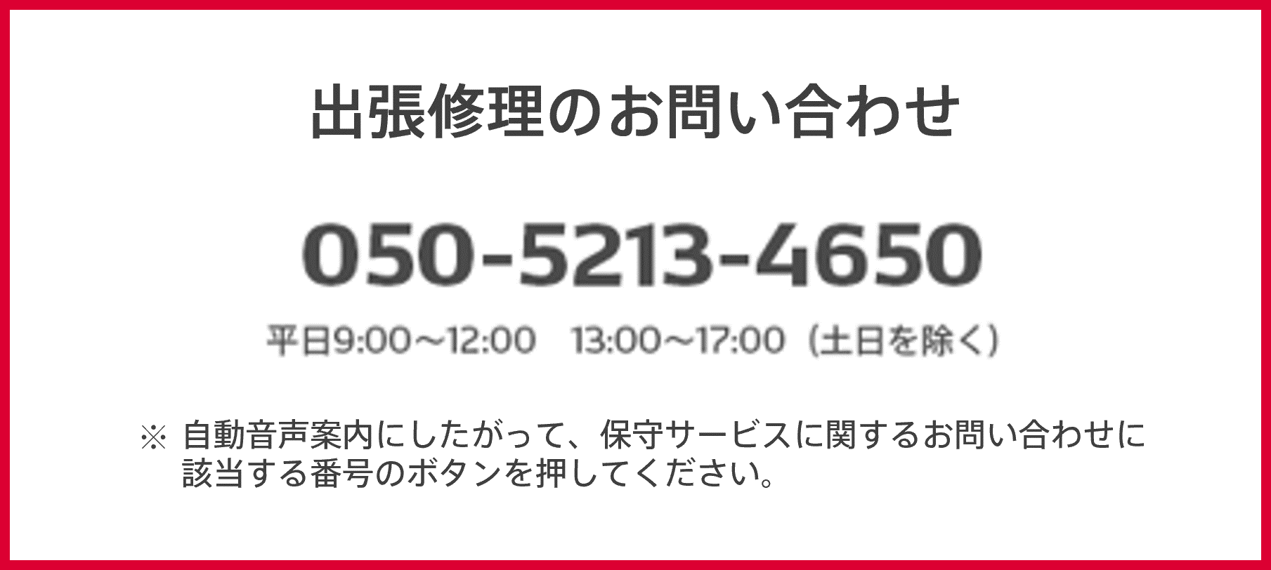 | 出張修理サービス | サービス技術者が現地に出張し、故障復旧対応をします。 | 受付時間 9:00~17:00 (平日) |
