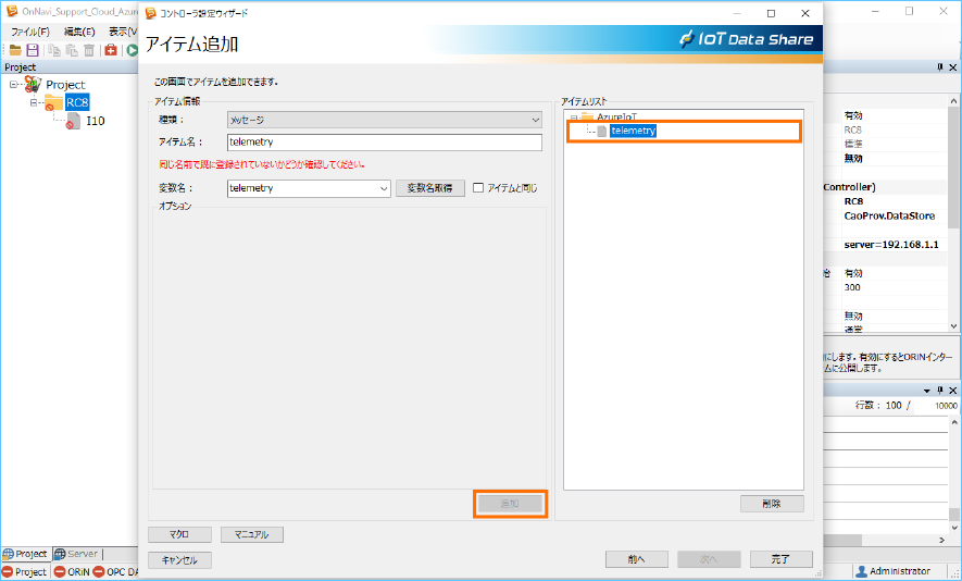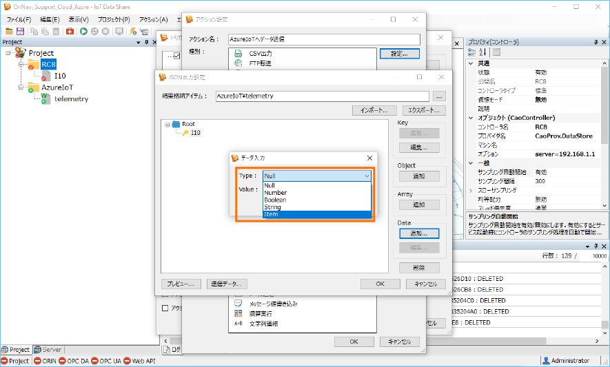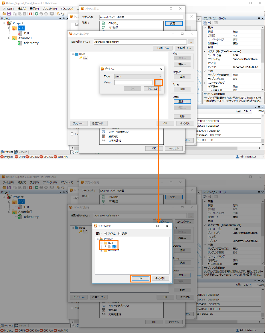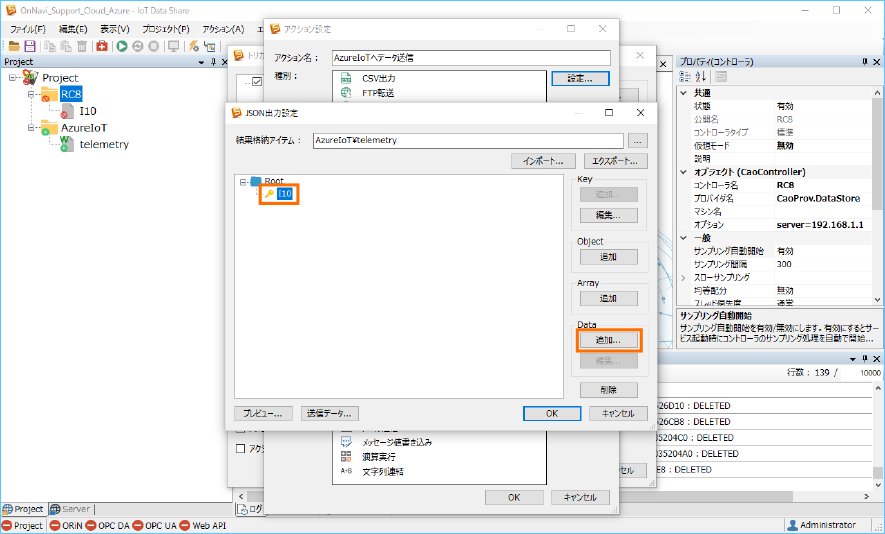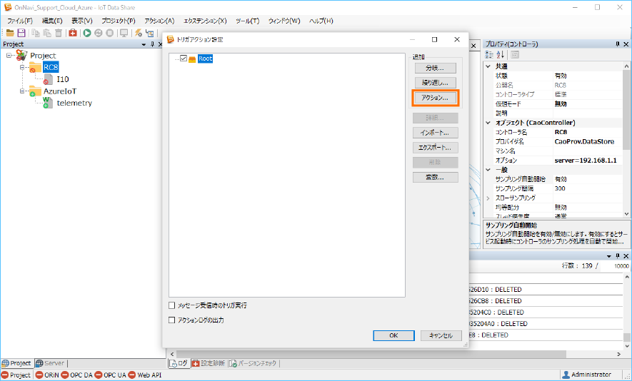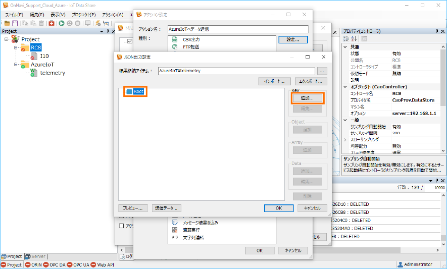 Azure IoT にデータを送信するために、送信アイテム ”telemetry” の属性と収集コントローラ ”RC8” のトリガアクションを