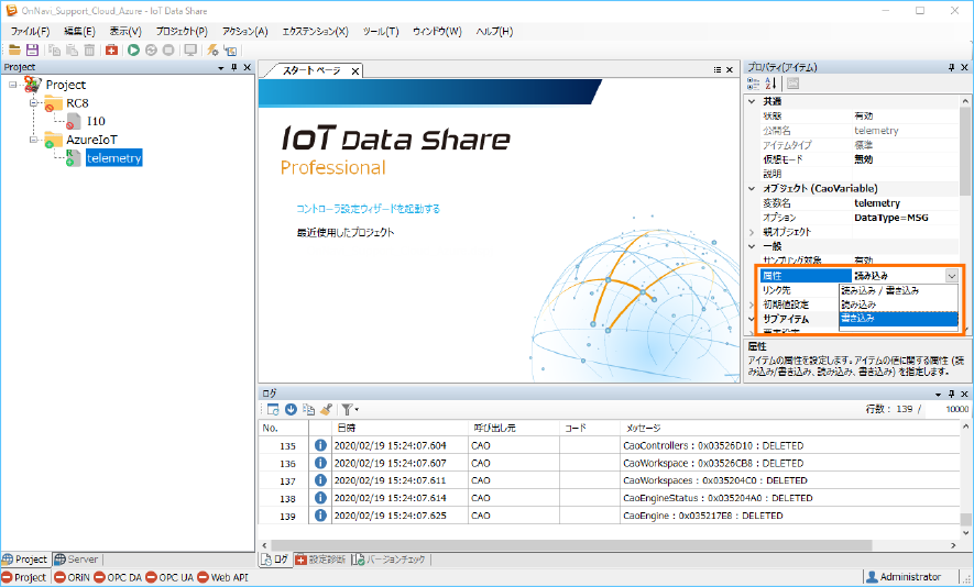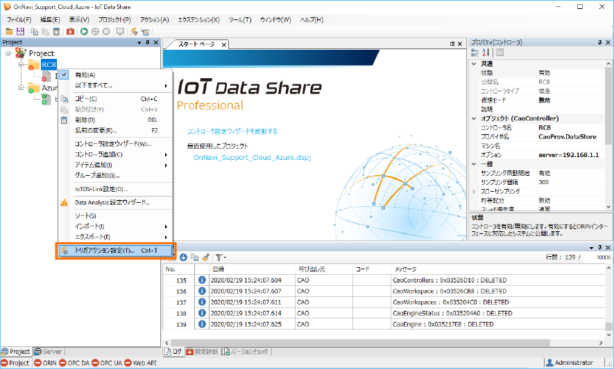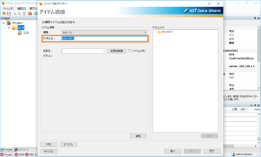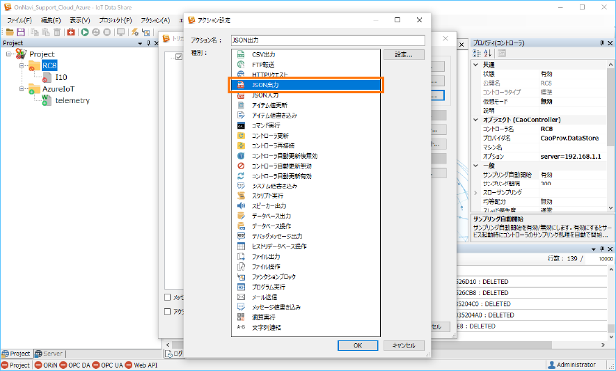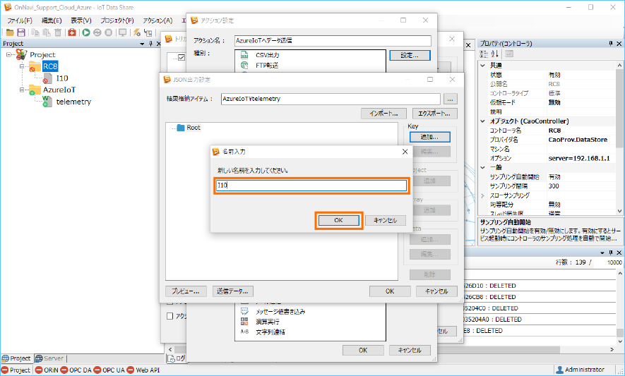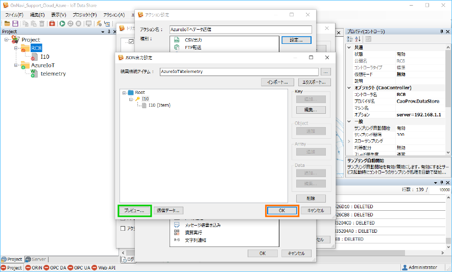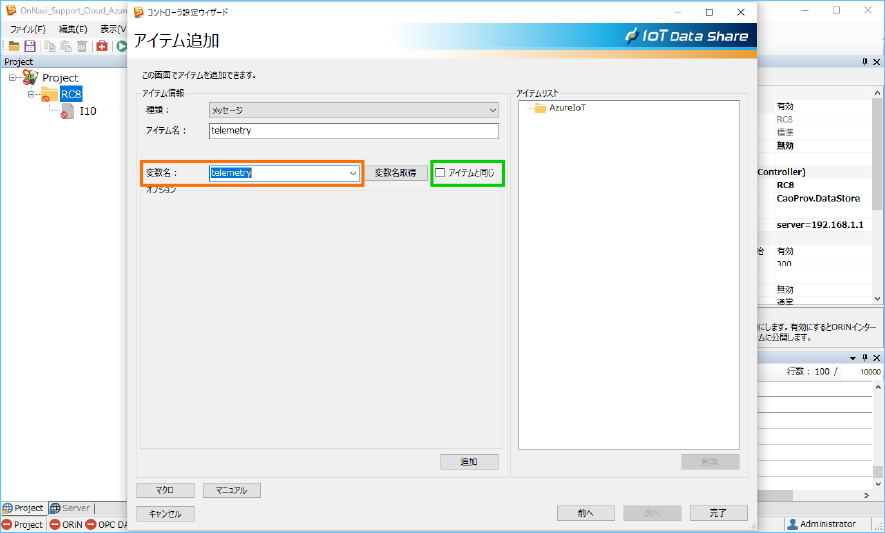 Azure IoT にデータを送信するために、送信アイテム ”telemetry” の属性と収集コントローラ ”RC8” のトリガアクションを