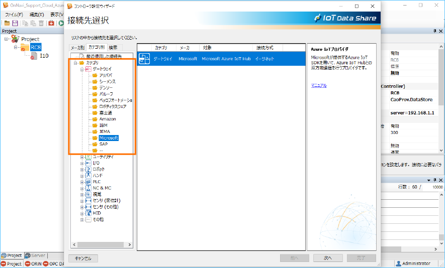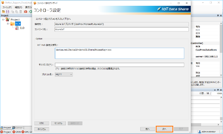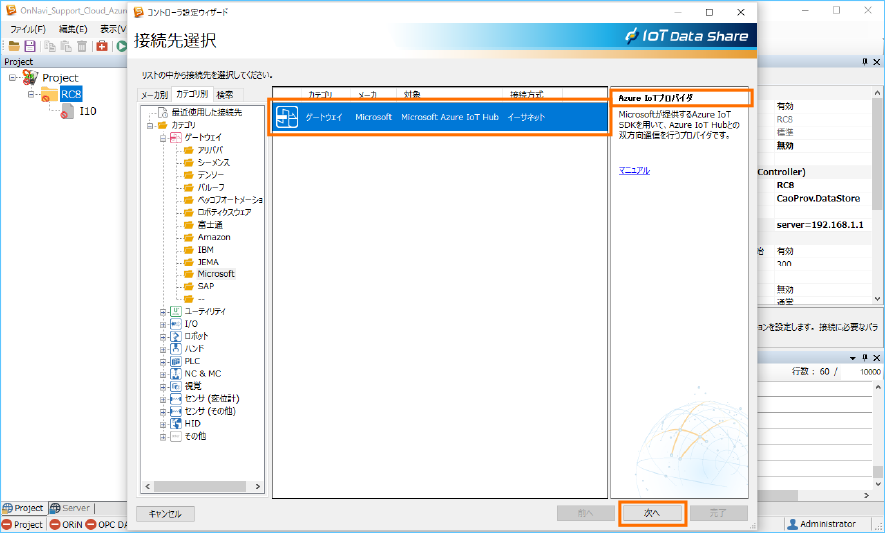 選択後、表示されるプロバイダ名が ”Azure IoTプロバイダ” になっていることを確認し、[次へ]ボタンをクリックします。