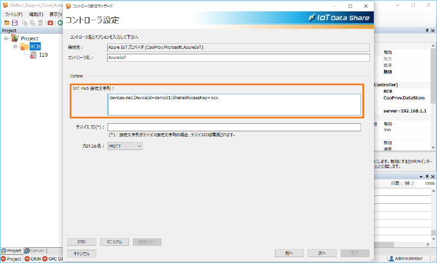 [Option]の[IoT Hub 接続文字列]を設定します。