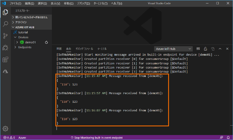 ※ここでは、データの確認に拡張機能(Azure IoT Hub)を追加した Microsoft Visual Studio Code を使用しています。
