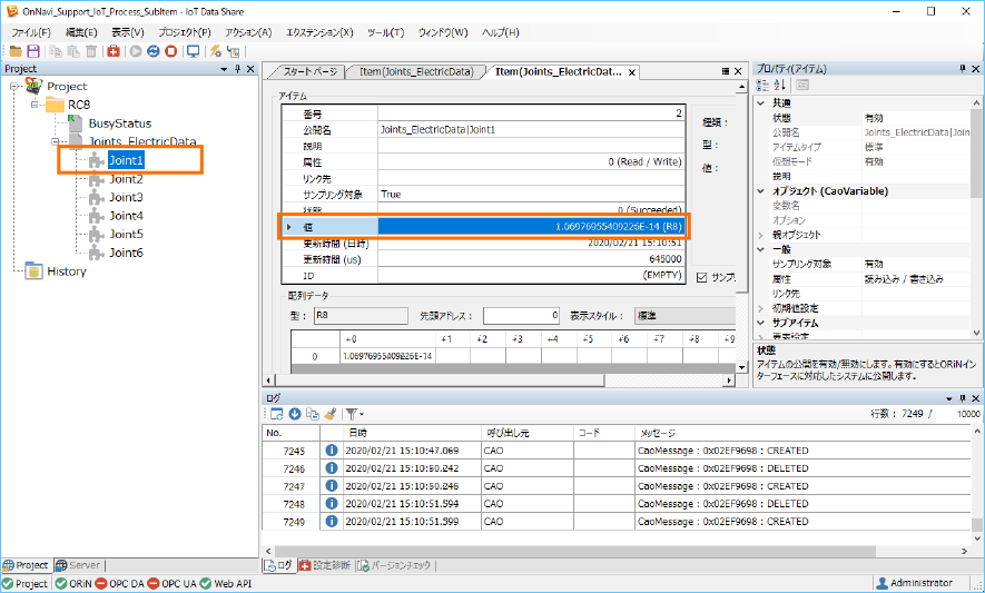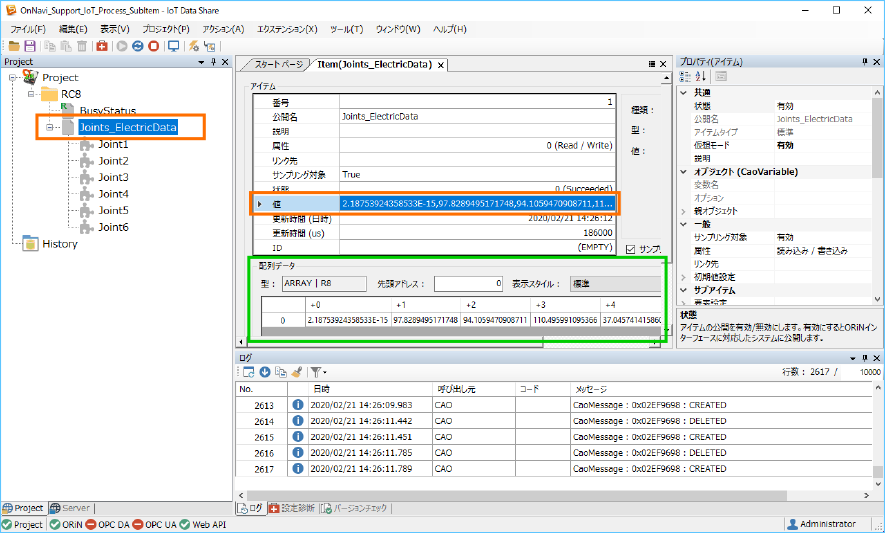 まずは、アイテム[Joints_ElectricData]をダブルクリックし、表示されるモニタ画面の[値]を確認します。
