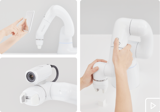 COBOTTA와의 작업은 전문적인 지식이 필요 없습니다‘ 로봇 팔을 직접 움직여 동작을 기억시키는 「다이렉트 티칭 기능」을 비롯하여 직감적으로 사용할 수 있는 GUI 나, 카메라를 이용한 티칭 기능에도 대응. 지금까지 로봇에 어려움이 있었던 분도 바로 사용할 수 있습니다.