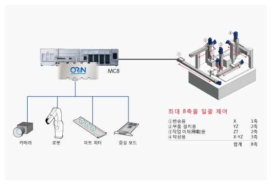 ● ORiN 탑재로 RC8 프로바이더를 활용할 수 있으므로 각종 FA기기와 연계가 간편하며 애플리케이션 전체를 로봇 언어로 제어 가능하여 프로그램 유지보수 공수를 감축.