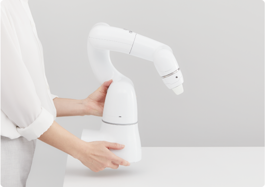 无需安全防护栅的人机协作机器人。防止夹伤的独特机械臂 构造,无锐利部分的外观设计。另外,6个可动部位均内置传感器,